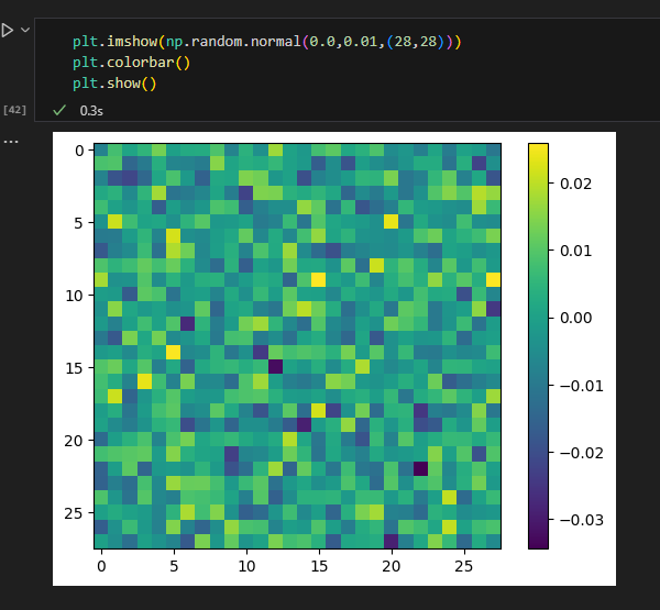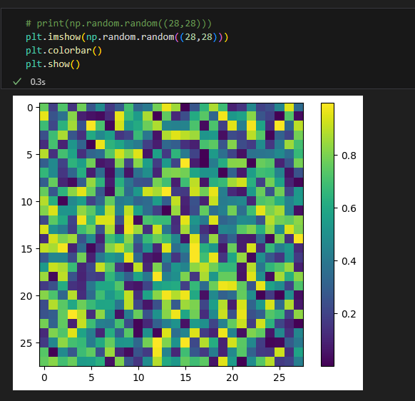 (28*28) 크기의 랜덤 한 값을 만들었습니다. 랜덤 값은 0~1인 것 같네요.