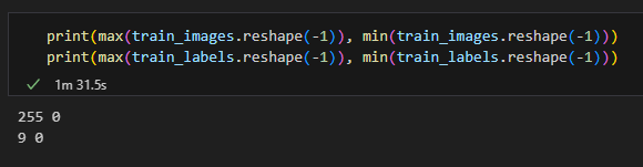 근데 이론상 들어갈 수 있는 값의 범위가 이렇다는 거지 실제로 들어가 있는 값의 범위는 아닐 수 있습니다. 실제 값의 최대, 최소를 출력합니다. reshape(-1)로 전부 1차원으로 만들고 최대, 최소를 뽑아냅니다.