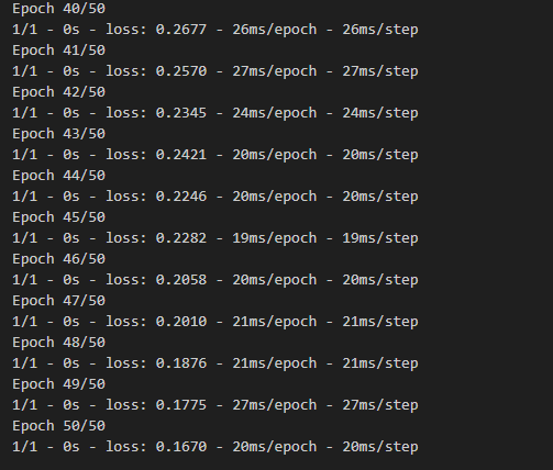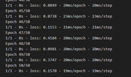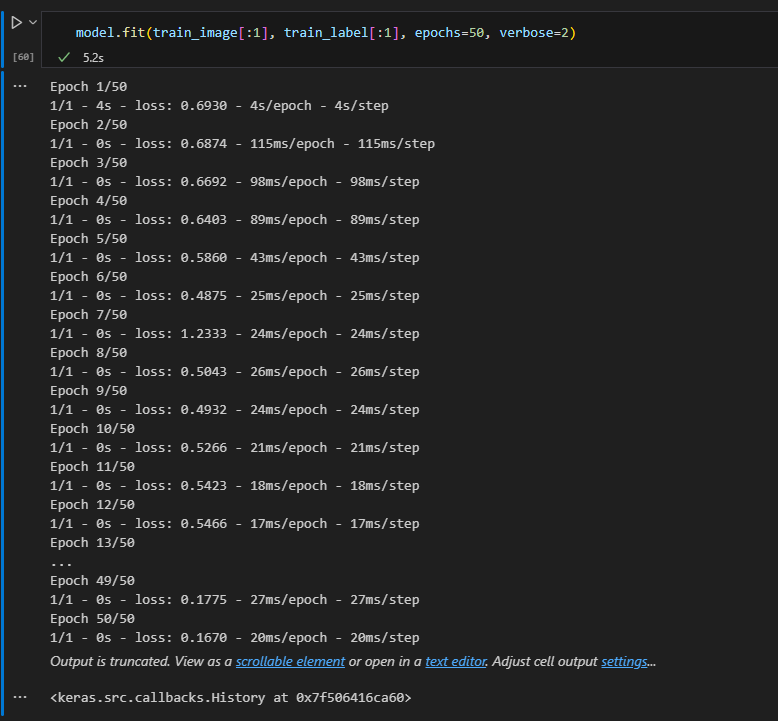 데이터가 적기 때문에 아마 오버피팅이 날 것입니다. 어차피 발생할 거 엄청 오버피팅 해보겠습니다. 학습 데이터는 1개, epochs를 50으로 해줍니다.