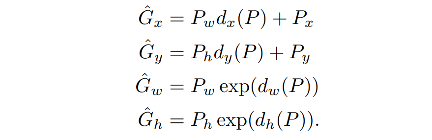저희가 예측한 사각형을 $P$, 거기에 대응하는 라벨링 된 사각형을 $G$라고 합시다. 저희는 $P$가 주어졌을 때 $G$를 예측하는 모델을 학습시킬 것입니다. 식으로 보면 $P$가 주어지면 $G$를 예측하는 $d$를 찾아야 합니다. 예측한 결과가 $\hat{G}$입니다.