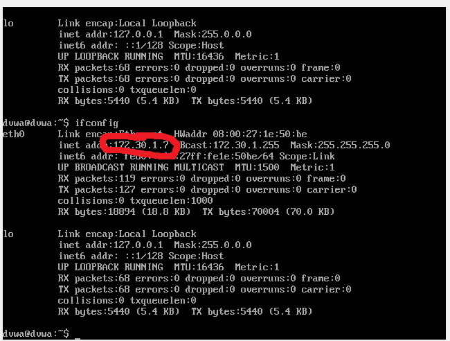 저번에 구축한 dvwa 실습 환경을 실행하고 ifconfig를 터미널에 입력해 줍니다.