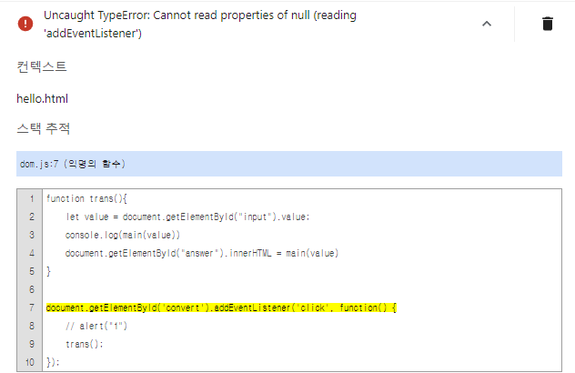 이번에는 convert를 찾을 수 없어서 그러는데 이건 dom이 로드되기 전에 해당 코드가 실행되었기 때문입니다. defer을 넣어 dom이 다 실행되면 로드되도록 해줍시다.