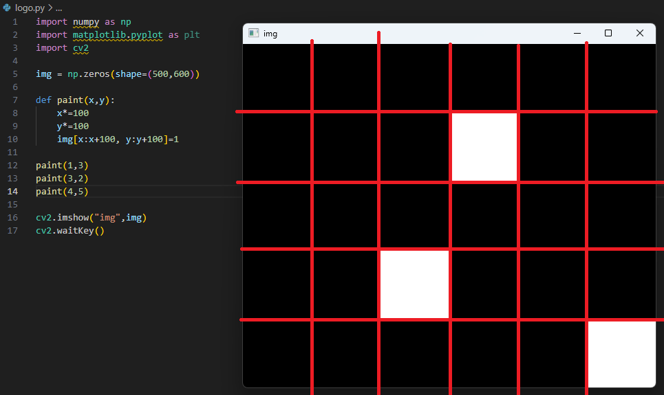 왼쪽 위가 (0,0), 오른쪽 아래가 (4,5)입니다. paint 함수는 해당하는 칸을 색칠해 주는 함수입니다. 이제 마저 만들어 봅시다.