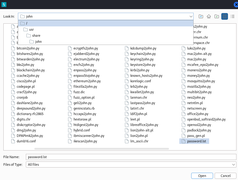 payload setting - load로 간 다음 /usr/share/john/password.lst를 열어줍니다.