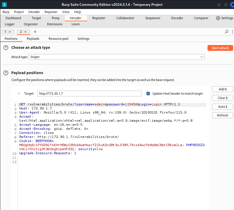 그리고 상단 intruder 탭으로 들어갑니다. 저희가 입력한 정보를 볼 수 있습니다.
