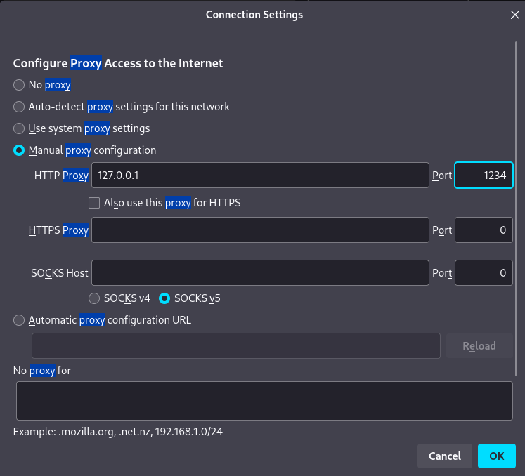 manual proxy를 체크해 주고 아래와 같이 입력합니다.