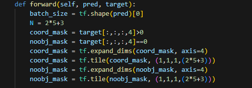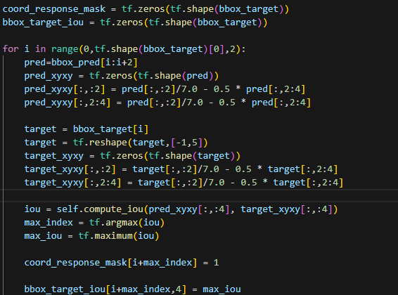 예측한 바운딩 박스와 타겟의 바운딩 박스의 IOU를 구한 다음 가장 많이 겹치는 박스를 구합니다. 셀 당 2개의 박스를 가지고 있고 결과가 7*7 크기이므로 아래와 같이 구현됩니다.