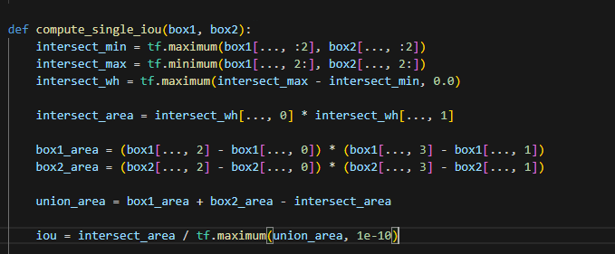 iou는 다음 함수로 계산할 수 있습니다. 이를 이용해서 위 식에 있는 compute_iou를 구현할 수 있습니다.