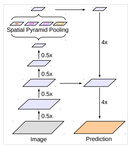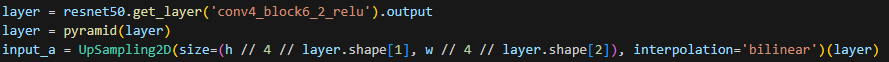 우선 입력 크기를 구합니다. AveragePooling -> conv -> batchNorm -> ReLU -> Upsampling을 해서 피라미드의 가장 하래 부분을 만들어 줍니다.