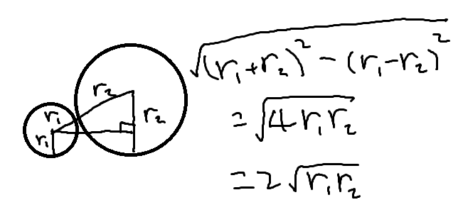 접하는 두 파이프의 반지름이 $r_1, r_2$일 때 중심 사이의 거리는 $2\sqrt{r_1r_2}$입니다.