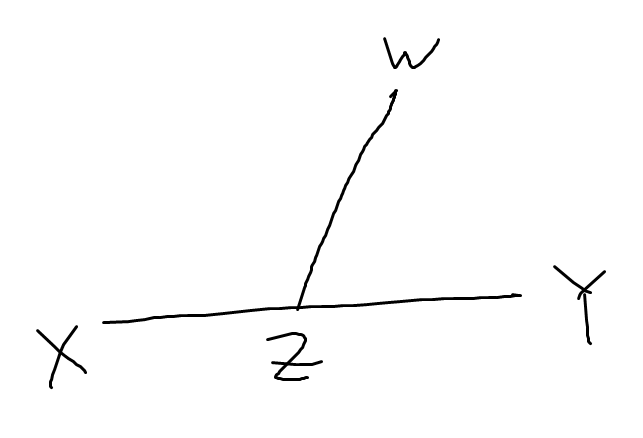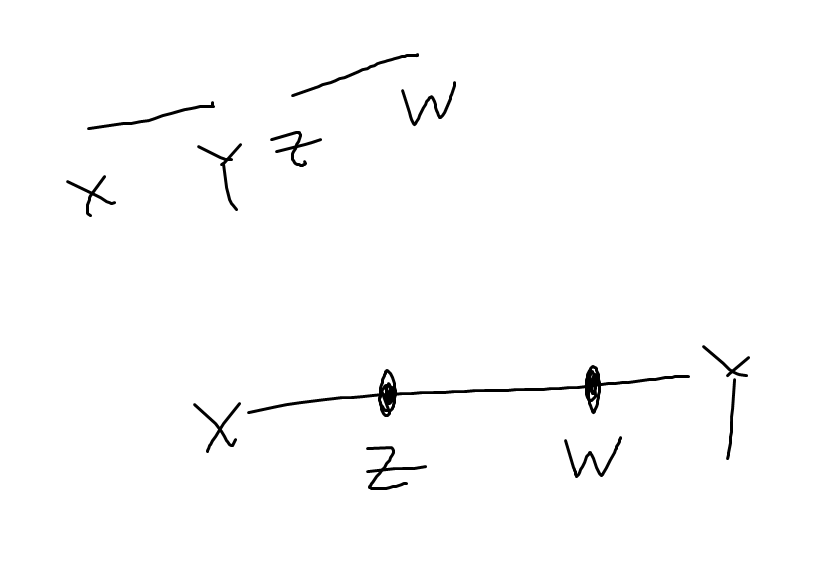 만약 CCW($XYZ$) * CCW($XYW$)가 0이면 $XY$ 직선 위에 $Z$나 $W$가 있다는 뜻입니다. 이 상태에서 CCW($ZWX$) * CCW($ZWY$)가 음수라면 이 두 직선은 반드시 교차합니다.