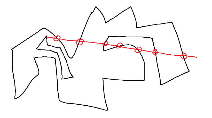 이제 하나가 다른 하나를 포함하는 경우입니다. 한 다각형의 꼭짓점에서 시작하는 아무 반직선을 그립니다. 이 반직선과 다른 다각형과 교차하는 선의 개수가 홀수개면 서로 포함 관계라는 뜻입니다.