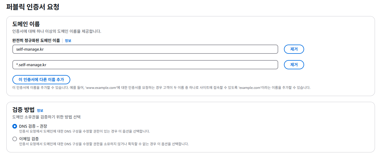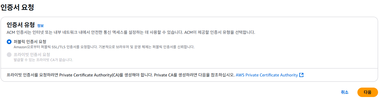 먼저 인증서 요청을 누르고 만들기를 하면 아래와 같은 창이 나옵니다. 퍼블릭 인증서를 요청합니다.