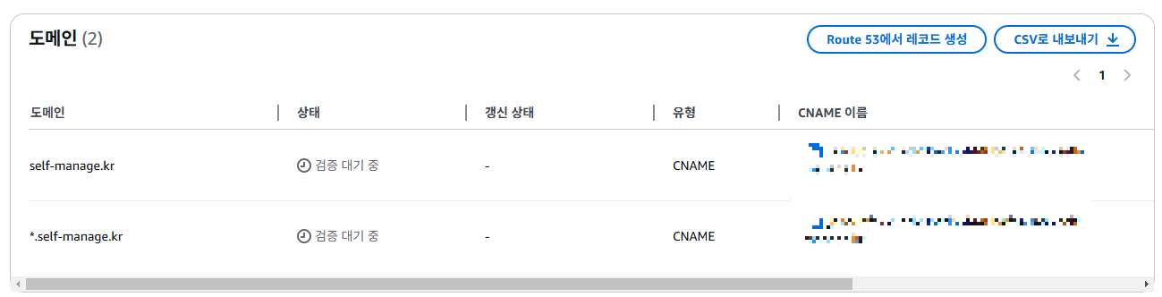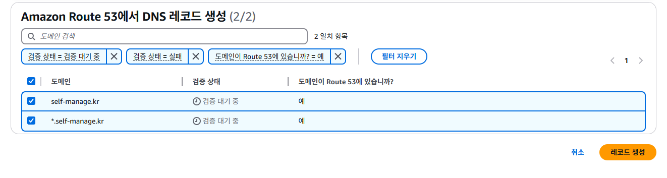 완료를 하면 인증 대기중인 도메인이 나옵니다. 이상태로 가만히 두는 것이 아니고 route53에서 레코드 생성을 해줘야 합니다. 오른쪽의 "Route 53에서 레코드 생성"을 누릅니다.