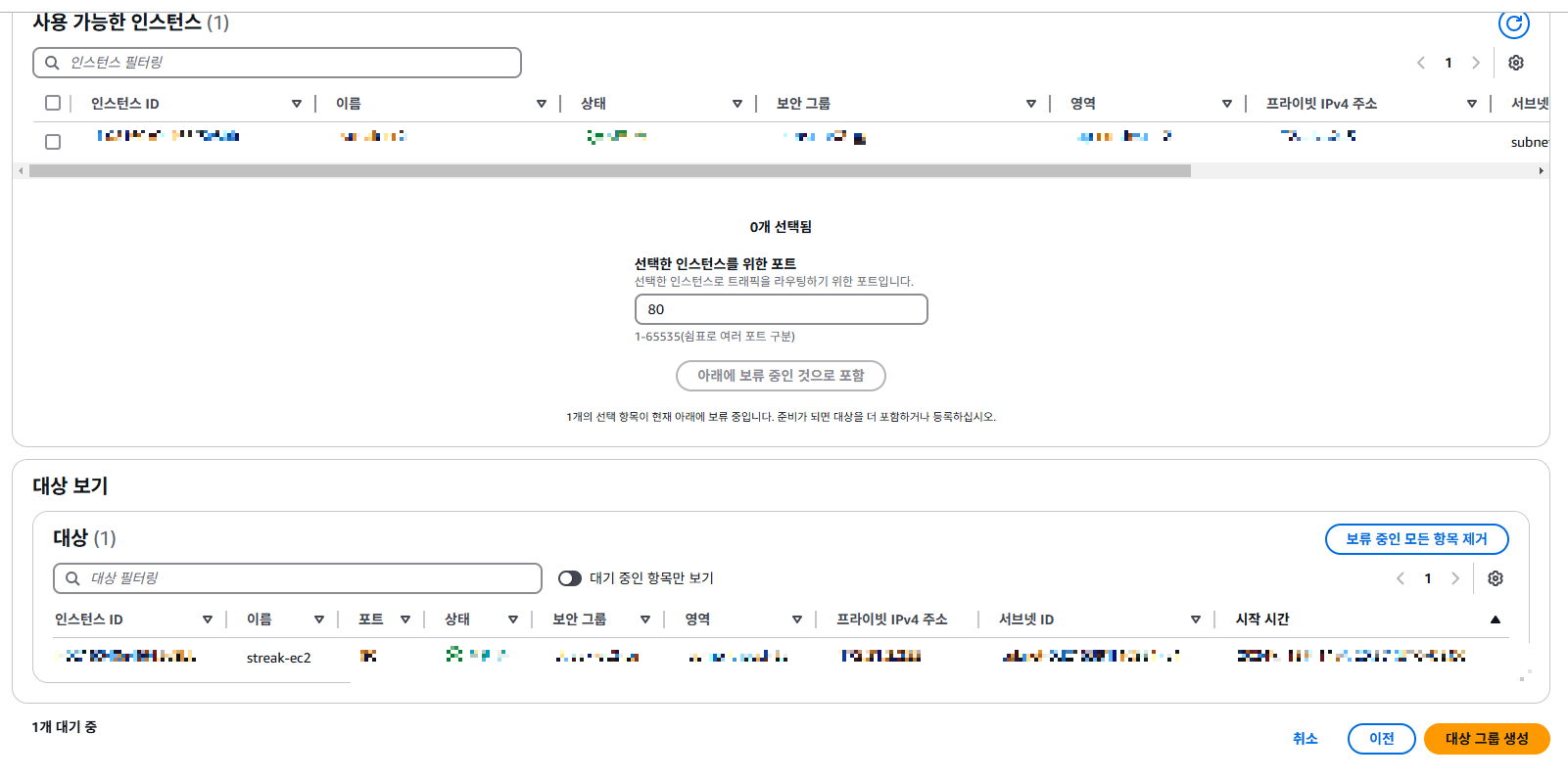 다음으로 넘어가면 사용 가능한 인스턴스가 나옵니다. 이 인스턴스로 들어오는 http://~~~:80을 대상으로 합니다.
