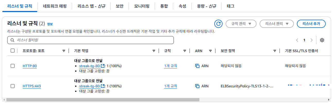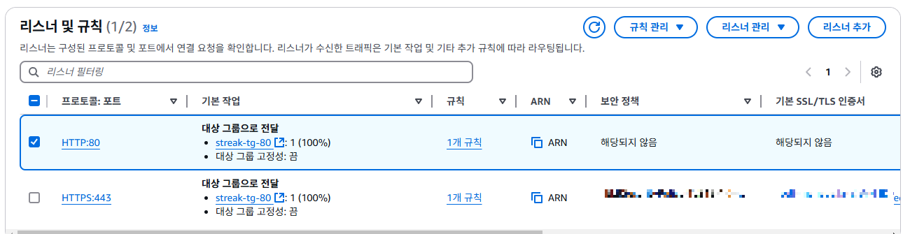 HTTP, HTTPS 모두 만들고 리스너에서는 아까 설정해 뒀던 대상 그룹을 선택합니다. 캡쳐를 잘못해서 그런데 기본 작업으로는 80번 포트를 넣어줍니다.