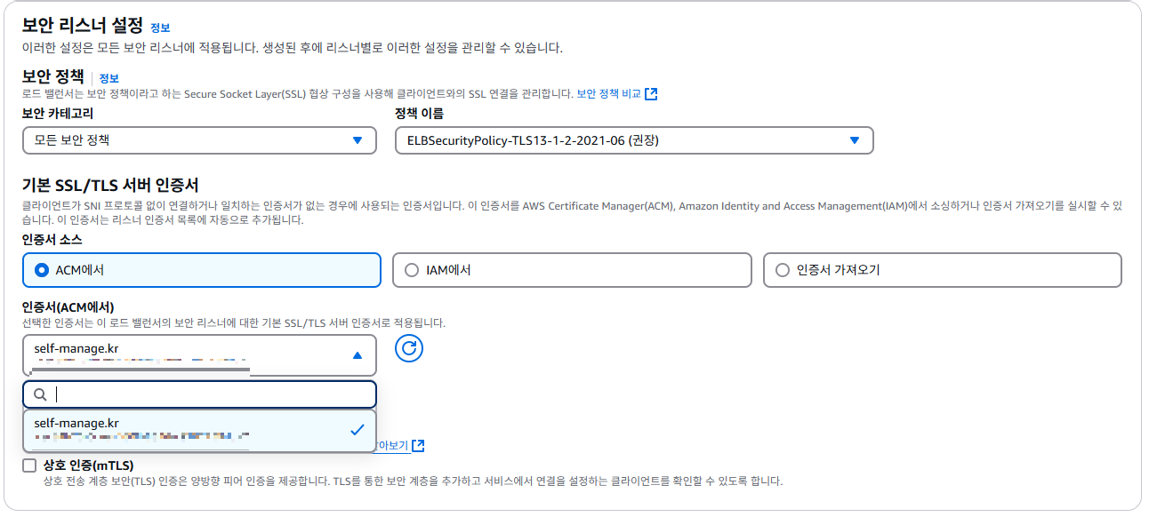 보안 정책은 원하는 인증서를 넣어주면 됩니다. 저는 ACM의 인증서를 넝허주었습니다.
