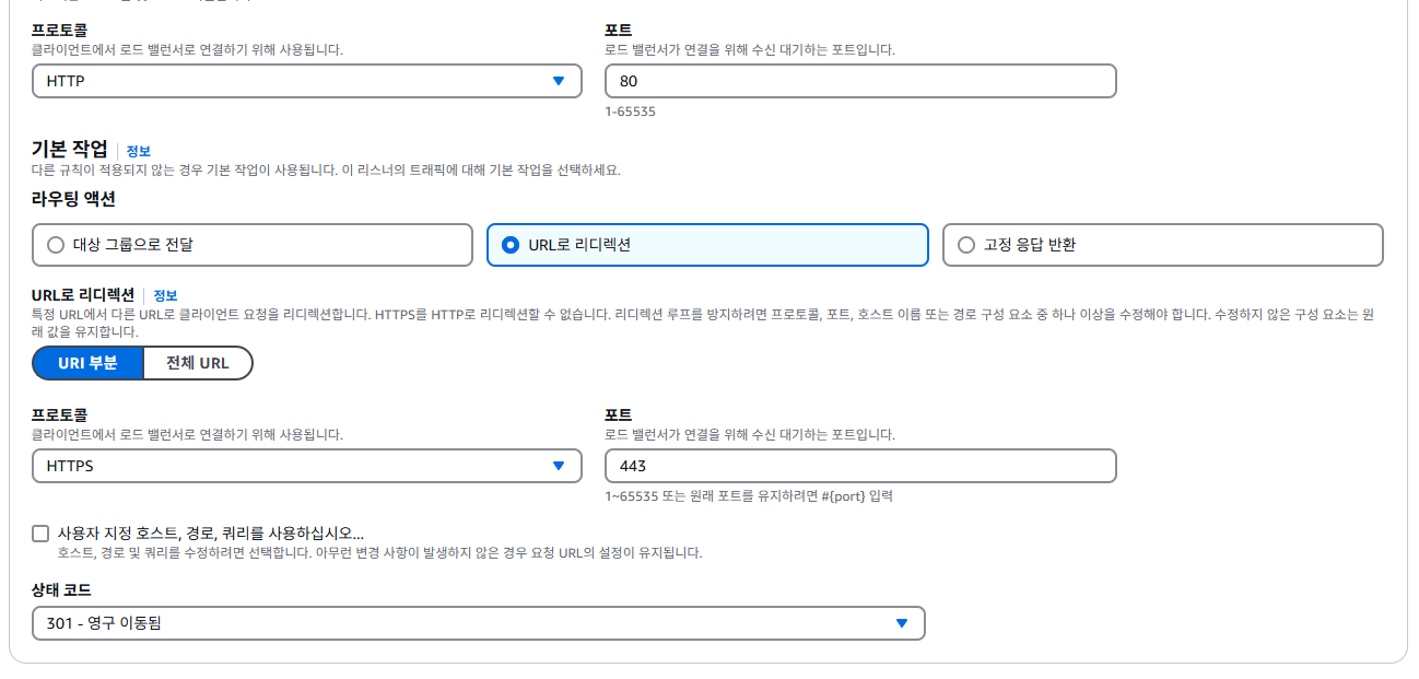 '대상 그룹으로 전달'을 'url로 리다이렉션' 으로 바꿔주고 443으로 연결해 줍니다.