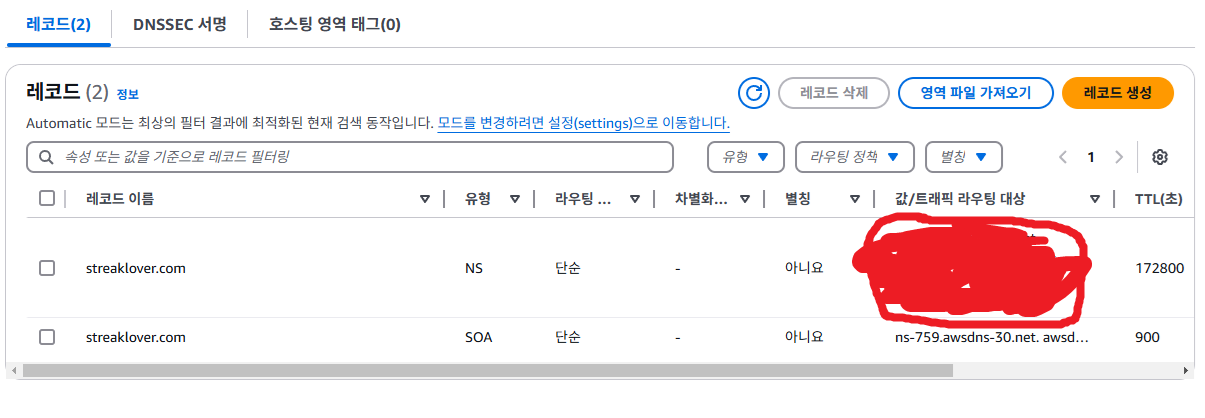 이제 ec2의 ip와 연결해 보겠습니다. 레코드 생성을 누릅니다.