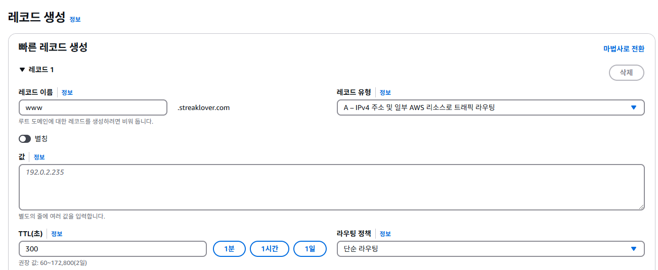 레코드 생성에서 이름에는 도메인 앞에 들어올 url, 값에는 연결할 ip(ec2 ip 주소)를 적어줍니다.