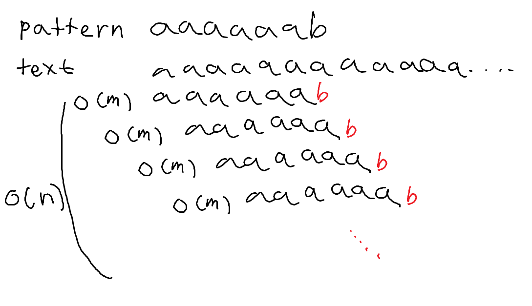 현재 비교하고 있는 pattern의 위치를 $i$, text의 위치를 $j$라고 합시다. 만약 두개가 일치하면 $i$, $j$ 모두 1 증가합니다. 일치하지 않으면 $i$가 적어도 1 감소합니다. 즉, $O(N+M)$에 해결이 가능합니다.