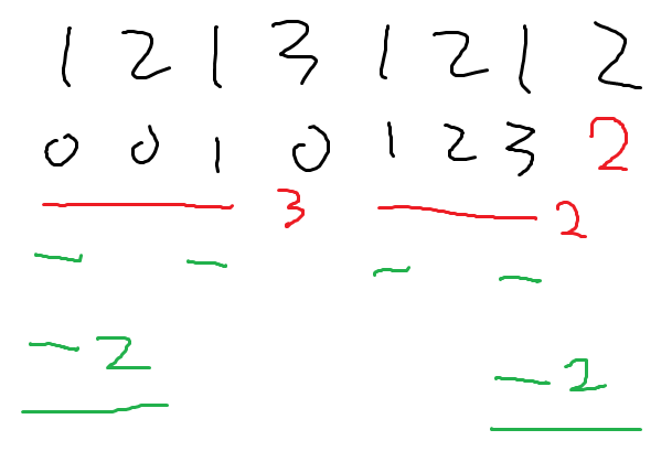 그럼 pattern[F[F[i-1]-1]] = pattern[i]면 F[F[i-1]-1]+1, pattern[ F[F[F[i-1]-1]-1] ] = pattern[i]면 F[F[F[i-1]-1]-1]+1, 이런 식으로 진행하면서 값을 채워주면 됩니다.