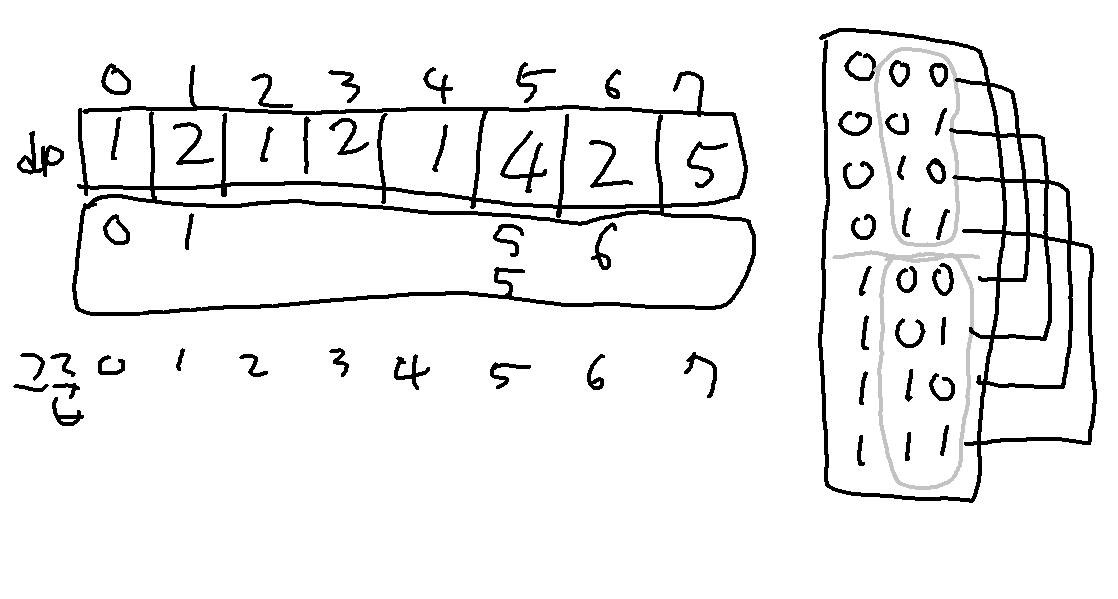 의 합으로 구할 수 있습니다. (2)는 그냥 dp[6]입니다. 0~3까지의 숫자들은 3번째 비트가 없습니다. 따라서