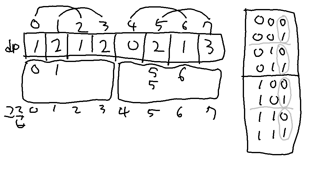 의 합으로 구할 수 있습니다. (2)는 그냥 dp[6]입니다. 0~3까지의 숫자들은 3번째 비트가 없습니다. 따라서