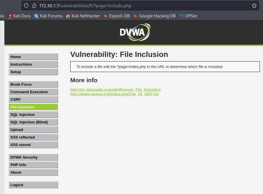 그렇다면 불러오는 파일을 저희가 지정할 수 있다면 악성 코드를 실행할 수도 있을 것입니다. dvwa의 file inclusion으로 가봅시다. 위의 경로를 보면 page=include.php가 있는 것을 볼 수 있습니다.(물론 이렇게 대놓고 있는 경우는 없을 것입니다.)