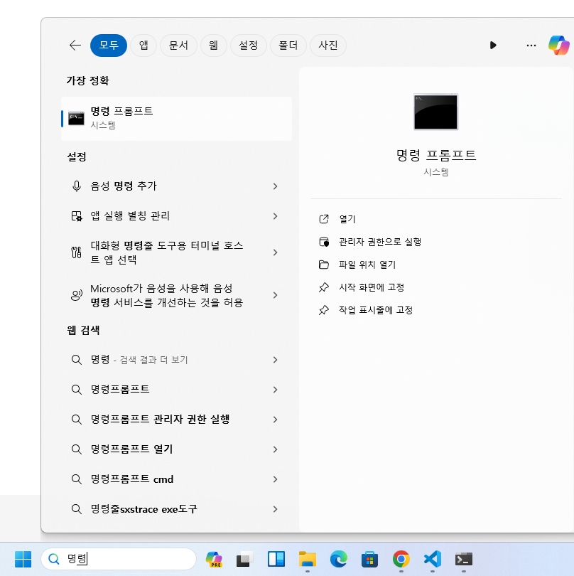 전부 진행되었으면 잘 설치되었는지 확인해 봅시다. 명령 프롬프트를 열어줍니다.