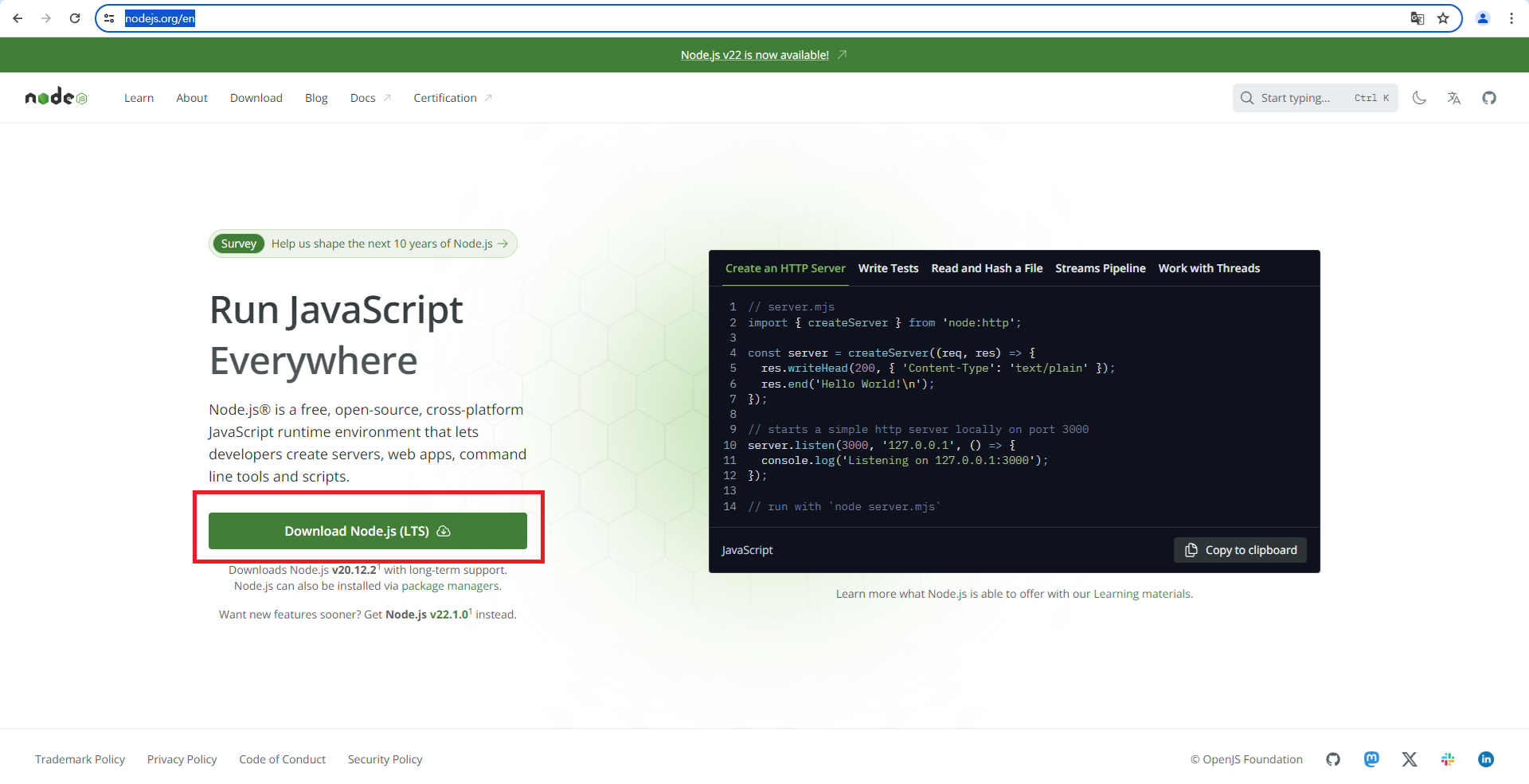 node 공식 사이트(https://nodejs.org/en)에 들어가서 설치 버튼을 누릅니다.