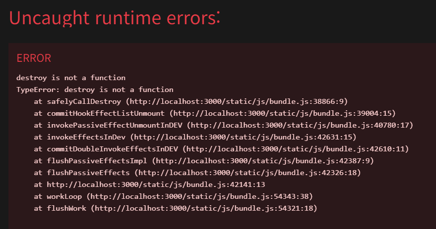 그러면 이런 에러가 여러분을 반겨줍니다. 이것은 useEffect에서 async를 사용했을 때 나타나는 현상입니다. 이 경우 아래와 같은 꼼수를 쓸 수 있습니다.