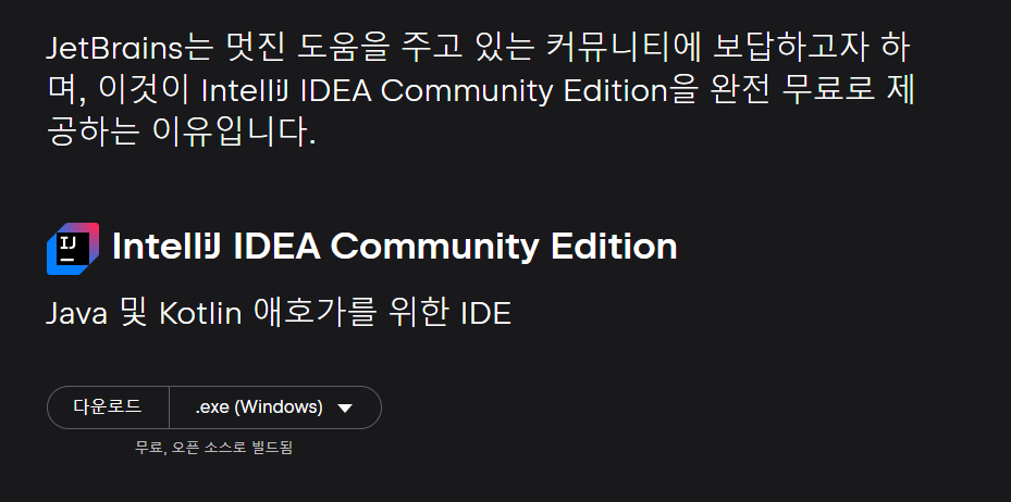 저는 intelliJ를 이용해서 개발을 할 것입니다. 크롬에 intellij를 입력해서 공식 홈페이지(https://www.jetbrains.com/ko-kr/idea/)로 이동합니다. 무료로 사용할 것이기 때문에 community 버전을 설치합니다..