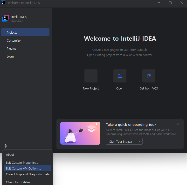 설치를 마친 다음 메모리 사용량을 조금 늘려 주겠습니다. 옵션의 VM option으로 갑니다.