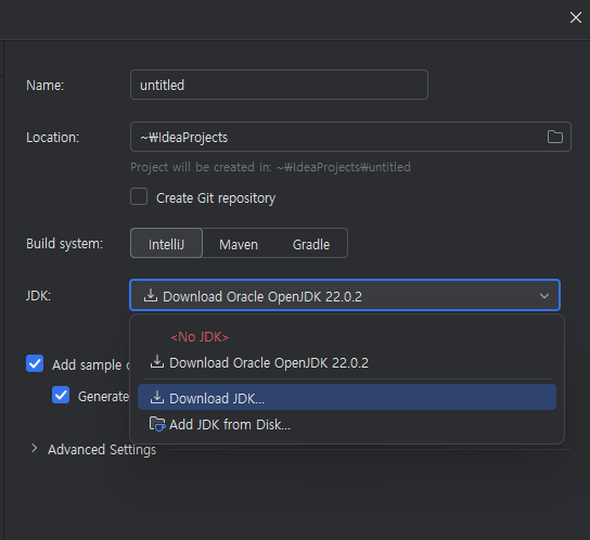 JDK 부분을 보면 자바가 없어서 아무것도 설치가 되어 있지 않은 것을 볼 수 있습니다. download jdk를 선택합니다.