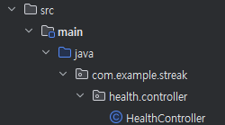 파일은 src - main - java - com - example - streak 위치에 계속 만들것입니다. 해당 파일에 package로 health, controller를 만들고 java class로 healthController를 만듭니다.