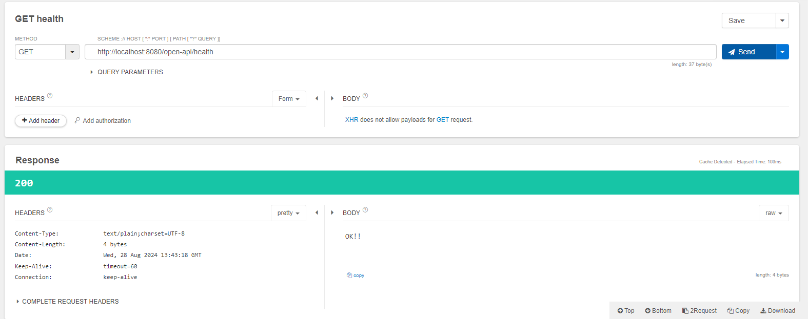 즉, {ip}/open-api/health를 get으로 호출하면 이 안에 있는 내용이 실행됩니다. 로컬에서 실행하고 있으니 http://localhost:8080/open-api/health가 됩니다.