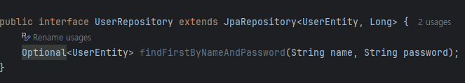 저는 name과 password가 일치하는 레코드가 있는지 찾아야 합니다. Jpa에 findFirstByNameAndPassword 함수를 넣어줍니다. name과 password가 일치하는 것 중 하나를 찾아줍니다. 없을수도 있으니 optional을 넣어줍니다.