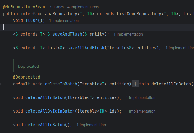 JpaRepository에 가보면 기본적으로 있는 것들이 있습니다. 이것들을 이용해 편하게 쿼리를 쓸 수 있고 직접 만들수도 있습니다.