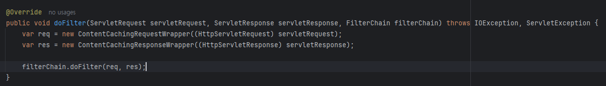 servletRequest를 HttpServletRequest로 형변환해 주고 이를 ContentCachingRequestWrapper객체로 만들어 줍니다. response에 대해서도 같은 행동을 합니다.