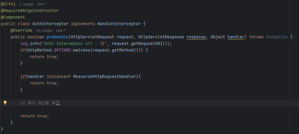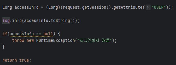 그리고 HandlerInterceptor를 상속하고 preHandle를 사용해 controller진입 전에 체크를 해 줄 것입니다.