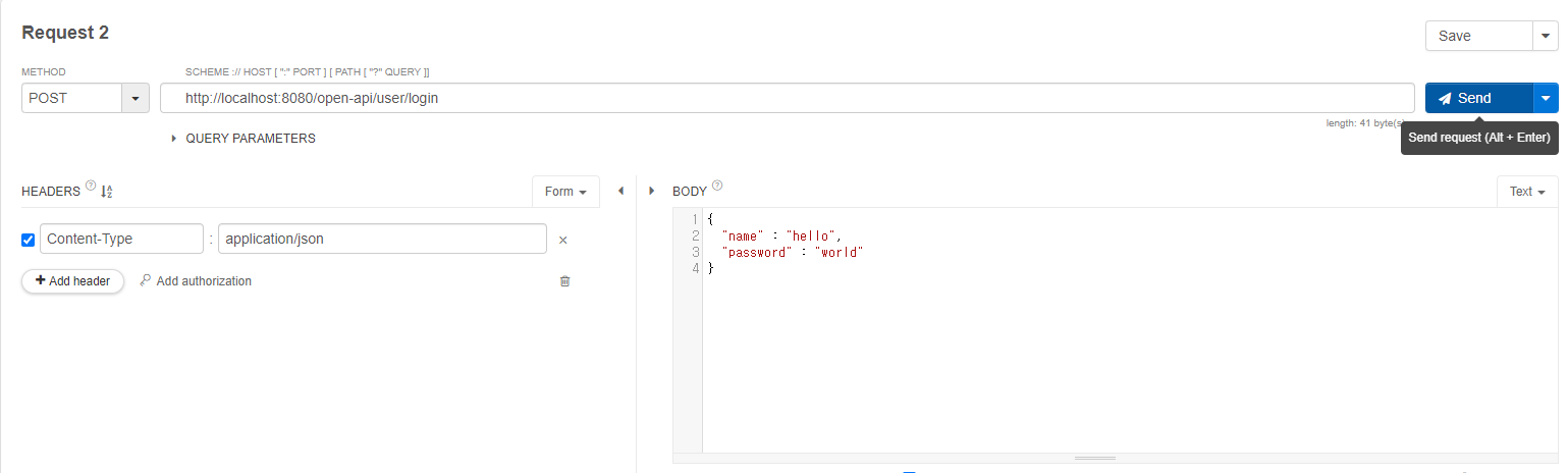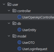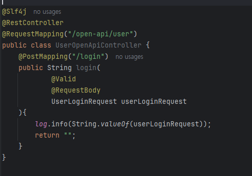 controller 패키지에는 아래와 같이 만듭니다. http://localhost:8080/open-api/user/login에 UserLoginRequest 형식으로 호출한다는 뜻입니다. 이걸로 로그인을 하는건 아니고 호출이 되는지만 확인할 것입니다. log로 넘어온 정보를 확인해 줄 것입니다.