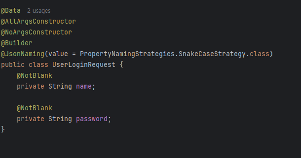 이제 UserLoginRequest에 어떤 식으로 입력해야 하는지 적을 것입니다. 이름과 비번을 입력받는데 빈칸이면 안되니까 NotBlank annotation을 넣어줍니다.