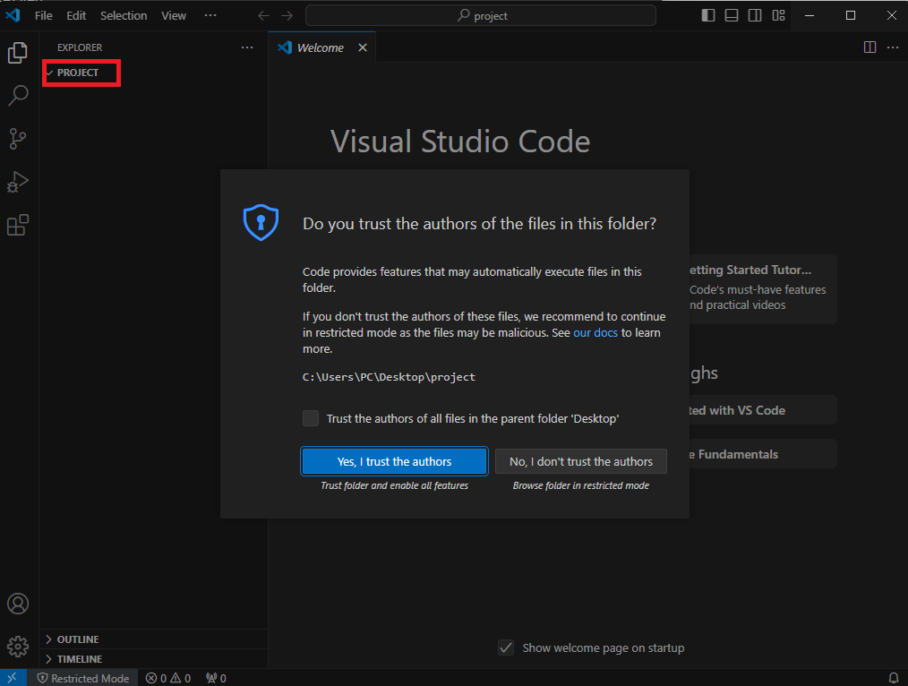 그럼 해당 위치에서 프로젝트가 열립니다. 뭔가 막 신뢰할 것이냐 하고 물어보는데 신뢰한다고 하면 됩니다.