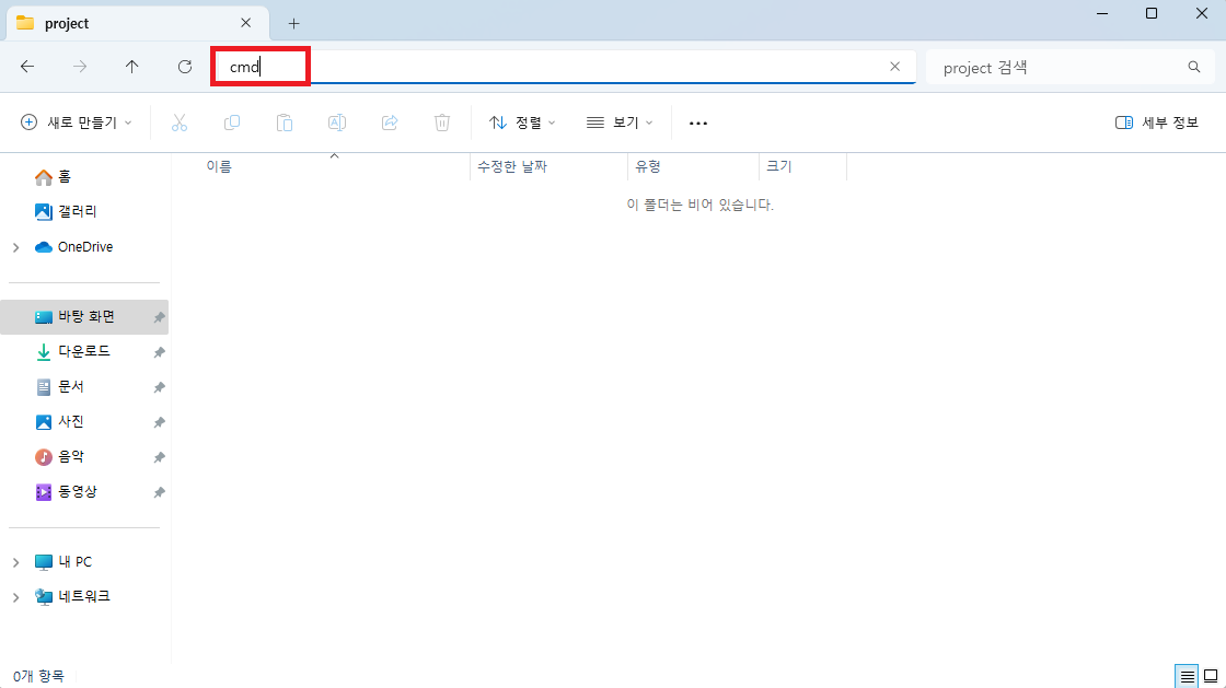 먼저 폴더를 연 다음 경로에 "cmd"(따옴표 제외)를 입력하고 엔터를 칩니다.