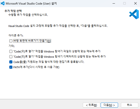 path에 추가할 것이냐, 편집기로 등록할 것이냐 하는데 이것도 다 체크되어 있으니 넘어가면 됩니다.