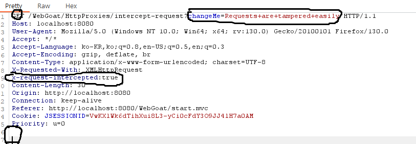 GET 추가, 파라미터 추가, x-request-intercepted:true 추가, body 제거를 합니다. 이때, 밑에 빈 줄 2개가 있어야 합니다.