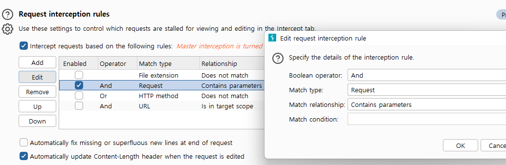 요청을 가로채 봅시다. proxy - proxy setting - request interception rules에서 규칙을 아래와 같이 수정합니다. 파라미터가 포함된 요청들을 가로채 달라는 뜻입니다.