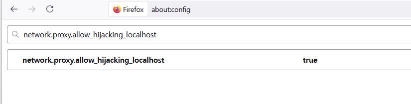 이 경우 about:config에 가서 network.proxy.allow_hijacking_localhost를 true로 바꿔서 해결할 수 있습니다.